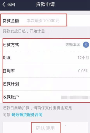 3、接下来,输入你需要的贷款金额以及还款方式,期限相关信息。然后再点击【确认使用】。如下图所示: