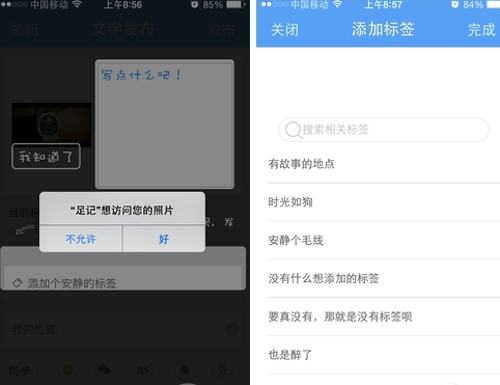 点击“足记”可以看到附近人分享的照片,以及一些热门的图片分享;在“发现”中可以搜索国家、城市、影视和人物,比如输入上海就会有相近的图片出现;“飞呀”中会有一个小飞碟带着你满处跑,告诉大家世界各地的信息;最后的“个人”就是自己账户里的图片等内容。