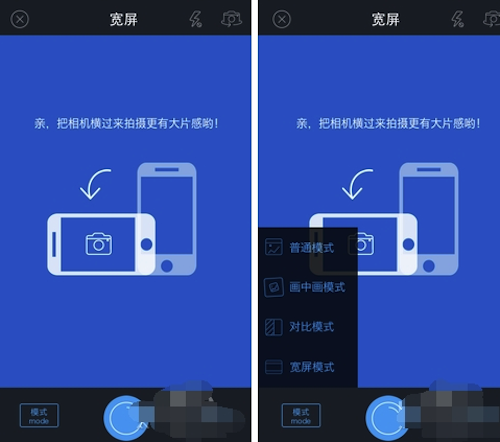 点中间的蓝圈会有文字、照相和爆料选项,选择照相会直接出现拍照功能,选左下角里面的横屏模式,可以直接拍,也可以到相册中选照片,很方便。