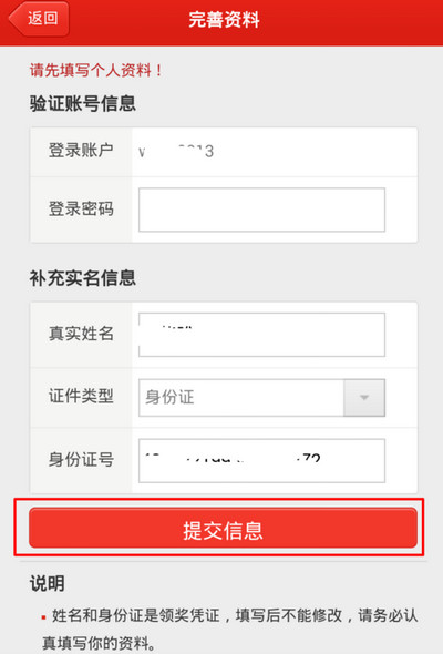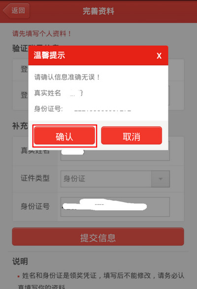 4、点击下一步之后,进入完善个人资料,进行实名认证,填写完成之后,点击提交信息,弹出确认框,点击确认完善资料。