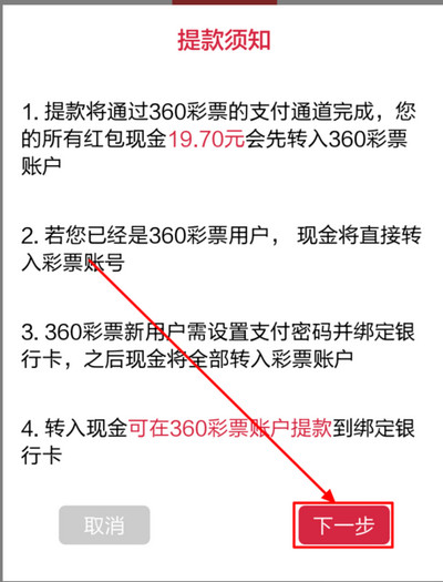 3、点击我要提款之后,弹出提款须知页面,点击下一步。