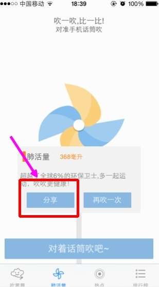 在测试完自己肺活量后,会出现自己的成绩。点击”分享“,选择一种社交方式,即可将自己的成绩分享至朋友圈中。