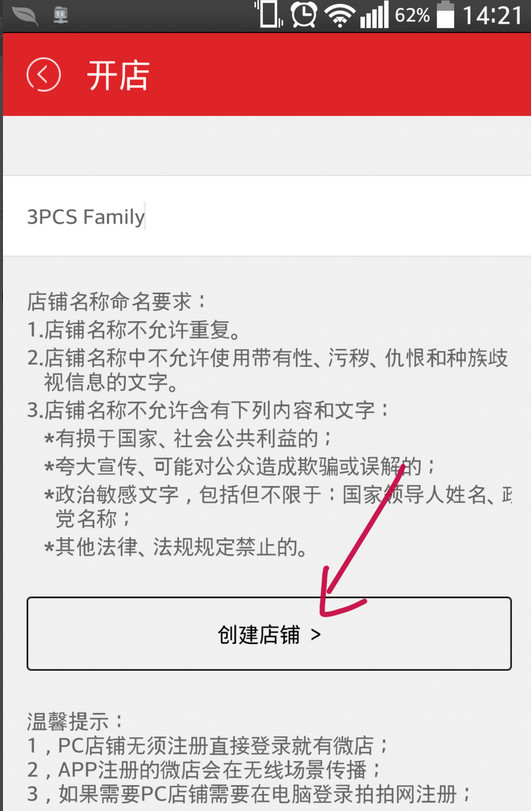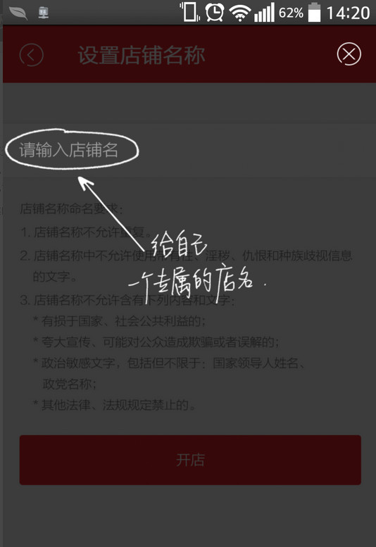 3、登录之后,第一步就是取一个店名了,店名以后可以随时进行修改。但建议还是考虑好自己的店名。