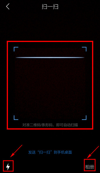 扫码界面左右分别有闪光灯开光和相册(可自动识别手机相册中图片上的二维码)