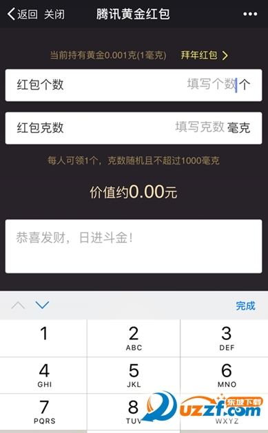 3. 填写红包个数和克数,点击“塞黄金进红包”,通过微信支付包好黄金红包;
