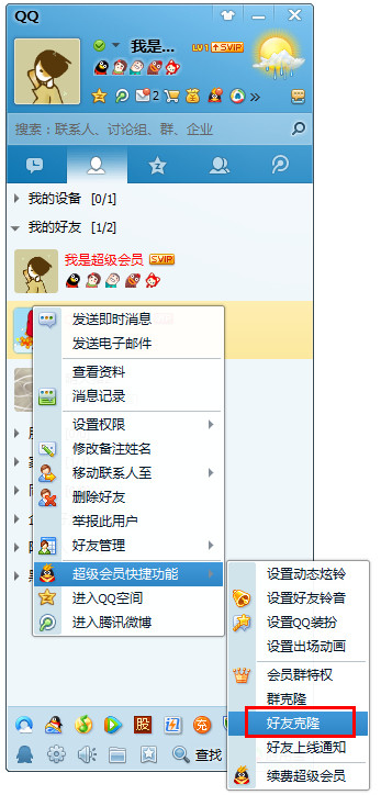 方式三、在QQ客户端上,右击任意一个好友,在弹出框中点击“会员快捷功能--好友克隆”进入,如下图: