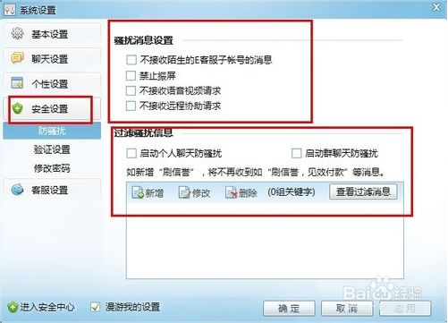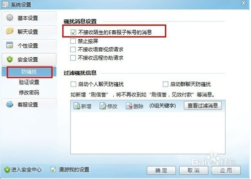 3、今天我们这里点击“安全设置”选项,在右边我们可以看到一些信息,如果我们收不到陌生人的信息,说明我们勾选了“不接受陌生的E客服子账号的消息”
