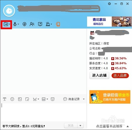 2、第一种方法,点击对话框上面的左起第一个图标(红框处)点击发送文件,或发送文件夹,单个图片可以点发送文件,多个图片可以建立一个文件夹,点击发送文件夹即可