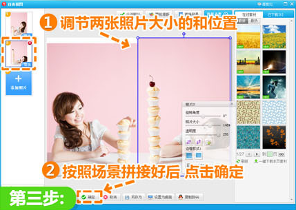 3、调节两张照片大小和位置,按照场景拼接好后,点击“确定”。