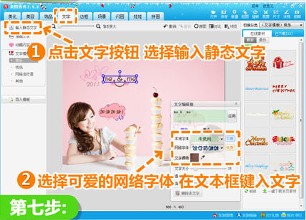 7、赶紧到“文字“菜单下,选择可爱的网络字体,在会话气泡中键入对话文字,并在饰品笑脸处添加“me & me”字样,搭配着笑脸是不是很可爱呀?