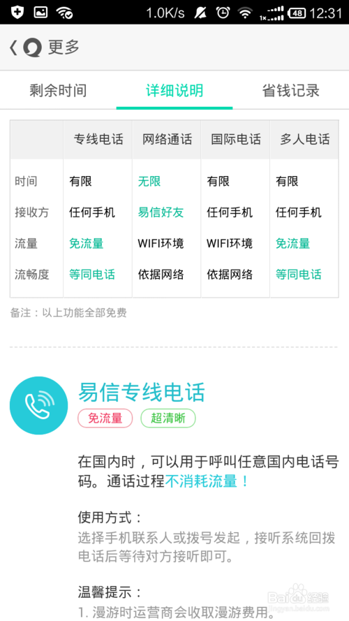 8、可以点击“详细说明”这个选项,能够查询到易信电话,多人电话,国际漫游的功能说明。