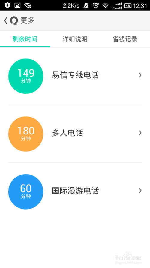7、想要了解易信电话自己打了多少时间,还剩余多少时间。可以点击右下角的“更多”选项,查看由于易信电话的更多详情。易信专线电话,多人电话,国际漫游电话各自剩多少时间。