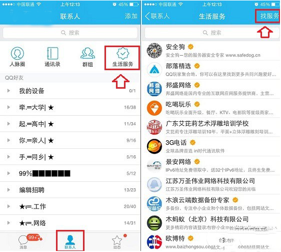 一、打开手机QQ,然后切换到【联系人】选项,再点击上面的【生活服务】,然后在生活服务页面点击右上角的【找服务】,如下图所示。