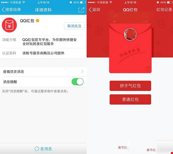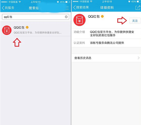 二、然后搜索“QQ红包”之后并关注QQ红包服务账号,如下图所示。