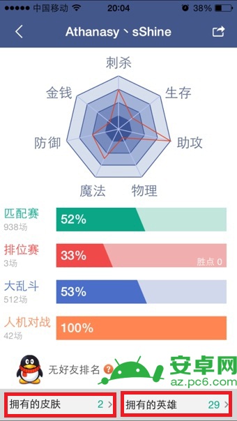 2、往下翻一点,找到【拥有的皮肤】或者【拥有的英雄】都可以查看皮肤。