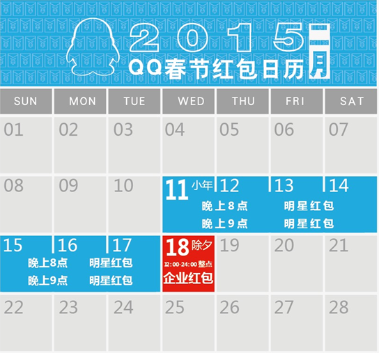 手机qq红包分为QQ“明星红包”和“企业红包”,发放时间从小年夜(2月11日)持续到除夕(2月18日)。