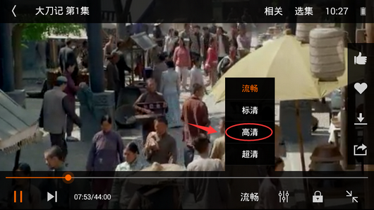 三,此时会出现“流畅”一般是流畅的默认,点击那里,就可选择视频不容标准,点击【高清】就可以咯