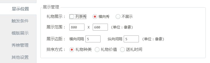 1. 礼物展示有三种:列表秀(竖向排列),横向秀(横向排列),不展示