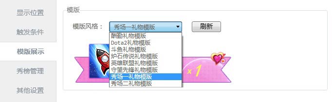 6. 某水友送【火箭】达到1个,就以【Dota2礼物模版】来展示送礼信息。