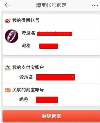 3、进入“账户绑定”页面后,如果你绑定了支付宝,就可以看到你绑定的支付宝了,这里默认的是新浪微博绑定的淘宝账号,所以你会看到“淘宝账号绑定”页面。在“淘宝账号绑定”页面的最下边,有一个“解除绑定”按钮,你点一下就会弹出“解绑成功”的的提示。