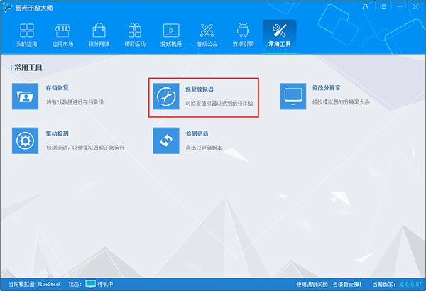 2、点击蓝光手游大师“常用工具”内的修复模拟器按钮