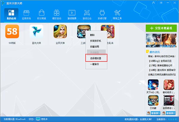 1、使用蓝光手游大师玩游戏很卡的时候可以在蓝光“我的应用”界面该游戏图标上右键鼠标有个“选择模拟器”的选项选择另外的模拟器引擎试试