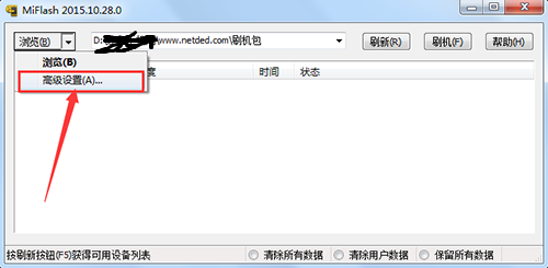 6:然后点击浏览按钮旁边的小箭头,选择高级设置,找到你刚才解压出来的线刷包的rom文件夹里的【flash_all_except_data_storage.bat】文件,然后点击确定