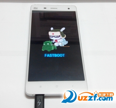 3:接下来手机要进入FastBoot模式,进入的方法:在手机关机状态下,按住音量键-和电源键,当屏幕中出现一只米兔正在修安卓机器人则已经进入FastBoot模式,如下图所示: