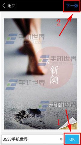 3)点击下方的文字可以编辑相册的【名称】,编辑好后点【OK】的按钮,接着点击右上角的【下一张】,跳转至第二张后,点击下方中间的【图片】按钮,从相册中选择一张图片。(如下图)