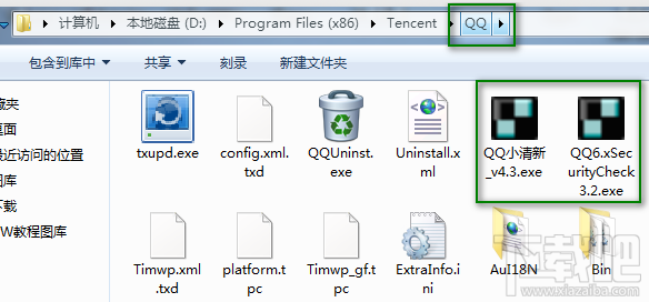 3.点击地址栏的QQ,到QQ根目录。将刚才解压得到的两个文件复制到此目录。