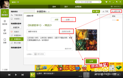 不过我们也不要为了QQ去掉这个功能而感到伤心,去掉这个功能我想应该是为了防止自己的隐私泄漏而考虑的吧,我们不能用qq音乐查看好友歌单,但是可以把好听的歌分享、推荐给自己的qq好友,也可以让qq好友帮你推荐歌曲。选择一首好听的歌曲,点击右边栏“点歌分享”,写上您要说的话,快乐的分享给您的小伙伴吧!