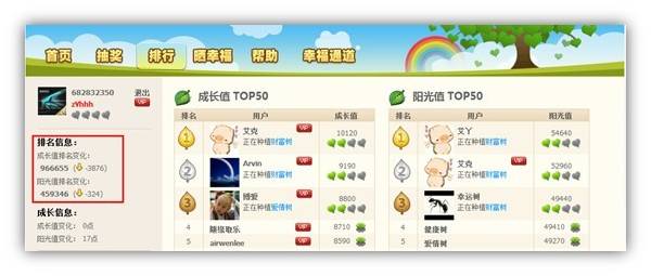 幸福树的排行榜主要是记录下载和上传数据最多的用户,根据当前的成长值以及阳光值分别进行排行,您可以通过左侧的排名信息中查看到目前的排名。