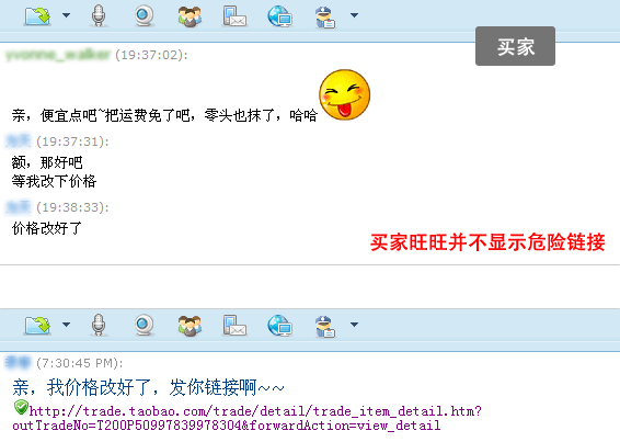 警防交易对方要求更换聊天工具:淘宝的卖家都会主动的使用阿里旺旺与您联系,如遇到卖家要您转用其他聊天工具时,您就要当心了,骗局往往都从这里拉开序幕。