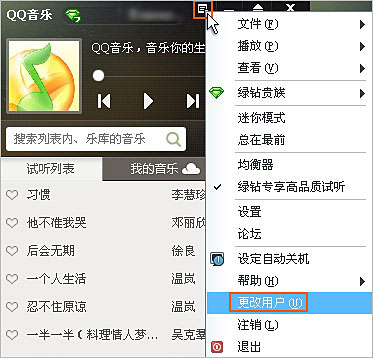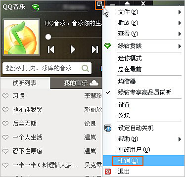 在QQ音乐播放器上方点击“主菜单”,选择“注销”,然后重新登录即可。