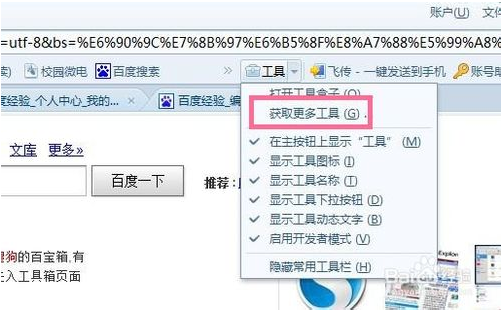 2、如果打开搜狗浏览器后工具栏中没有截图,你可以点击【工具】然后再进入【获取更多工具】。