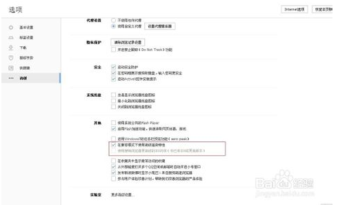 7、在“选项—基本设置”界面,我们点击高级选项,将鼠标往下移动,直至找到“在兼容模式下……”并在它前面打上√即可。