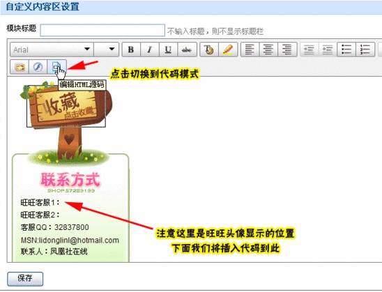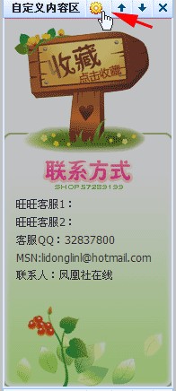 下图范例中,我们就将旺旺插入到了左侧的收藏模板中,找到要添加代码的“自定义内容区”模块,点击编辑按钮:
