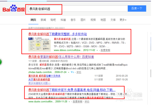 4、当然,我们可以手动的去下载安装暴风影音的解码器。在搜索栏中输入暴风影音解码器,就会出现下载结果。
