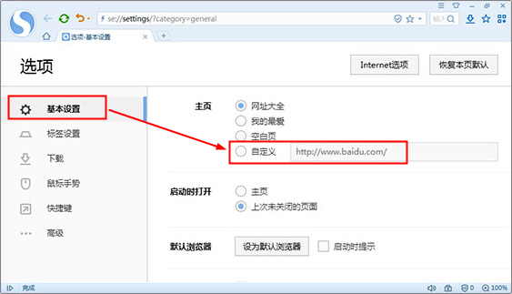 第二步:在主页选项中,可以自由设置“网址大全”、“我的最爱”、“空白页”和“自定义”的网址。并且可以选择启动时打开“主页”或者“上次未关闭的页面”。