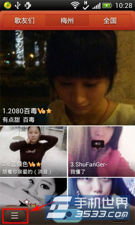 1)首先打开唱吧,进入首页,点击“三横”按键,在进入功能界面后,点击“包房K歌”按键。