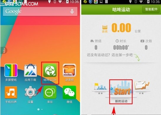 2、打开咕咚运动软件,进入首页,点击“新的运动”按键。