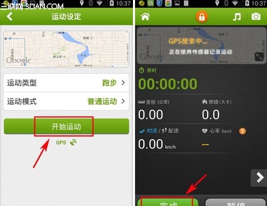 4、在进入运动设定界面,点击“开始运动”按键,然后在进入记录界面,当自己跑完后,按完成按键即可。