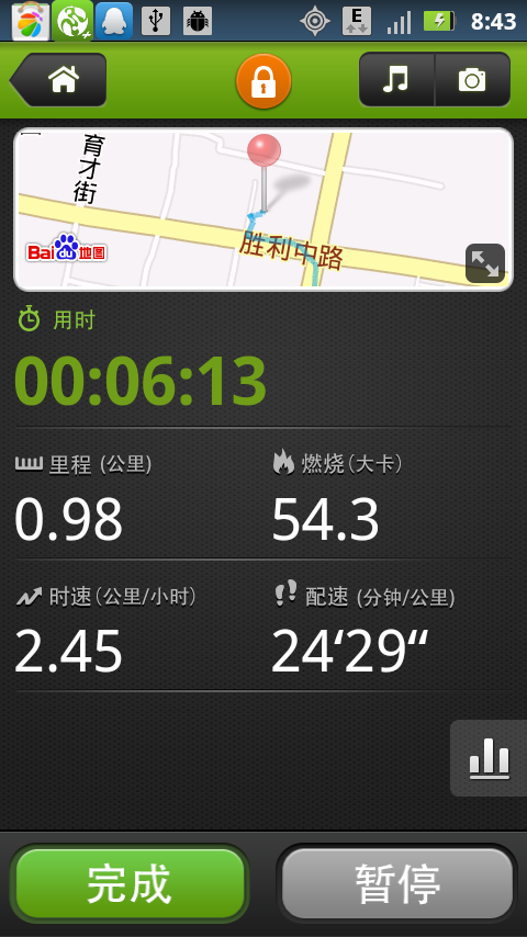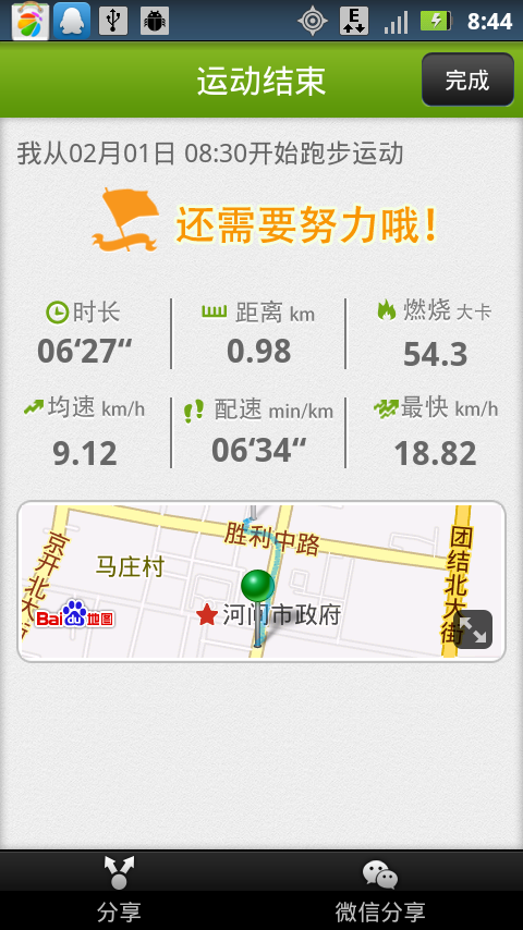 点“发布”或“取消”来到本次记录总括界面,可以点分享通过本机上的其他软件与朋友分享这次记录,点“完成”后退回到主界面。
