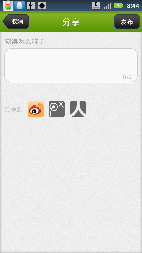 保存后会提示你是否把这次记录同步发往新浪微博、腾讯微博、人人网