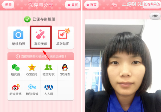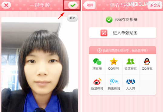3、内置7种美颜风格,选择好后点击右上角的勾,同时还支持分享到微信朋友圈和QQ等。