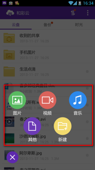 进入文件管理页面,点击“+”上传按钮,可以选择上传图片/视频、音乐、文档、文件以及新建文件夹,其中图片可拼图上传。上传文件步骤如下: