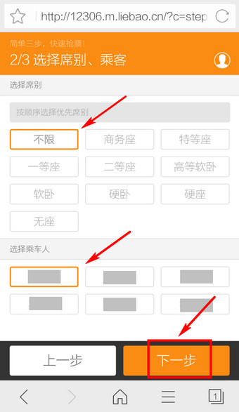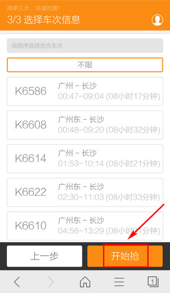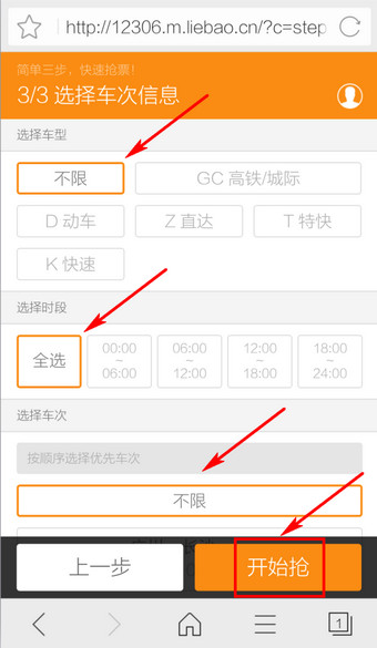 7.选择【车型】、【时段】、【车次】(下滑选择)后点击【开始抢】