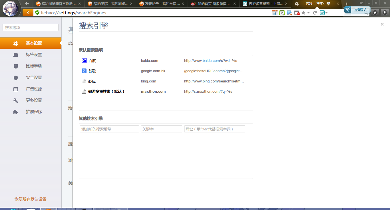 多重搜索是一项非常方便的功能,可以在同一页面直接打开不同引擎间的搜索结果可惜猎豹没有提供多重搜索引擎,扩展也不给力,怎么办呢?自己动手做一个吧,我们以傲游多重搜索引擎为基础如下图: