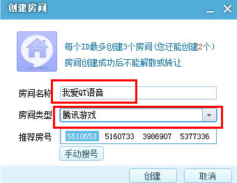 目前QT语音所有用户都可以创建房间,个人创建的房间为7位ID,该ID为系统随机发放,在创建时候可以选择系统分配的ID号,或者手动搜号。
