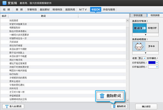 如果卡拉OK歌词字幕添加有误,需要删除,那在“卡拉OK”面板的歌词列表右下角点击“删除歌词”按钮即可。